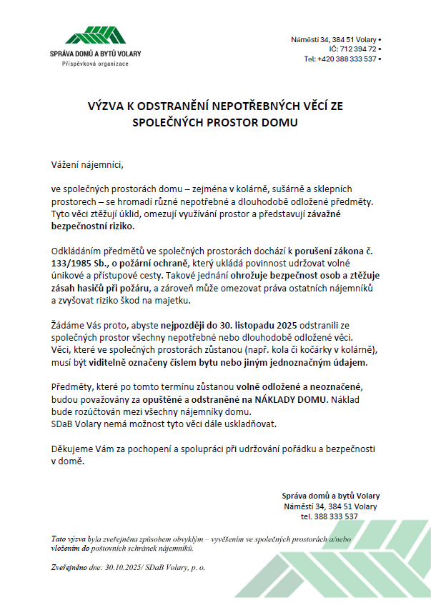 Dne 30. 10. 2025 jsme ve všech bytových domech ve správě SDaB Volary, p. o., vyvěsili výzvu k odstranění nepotřebných věcí ze společných prostor domu.